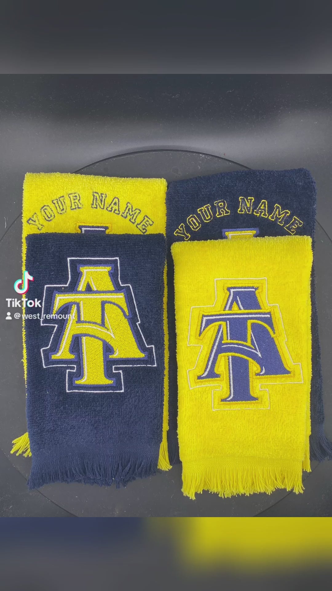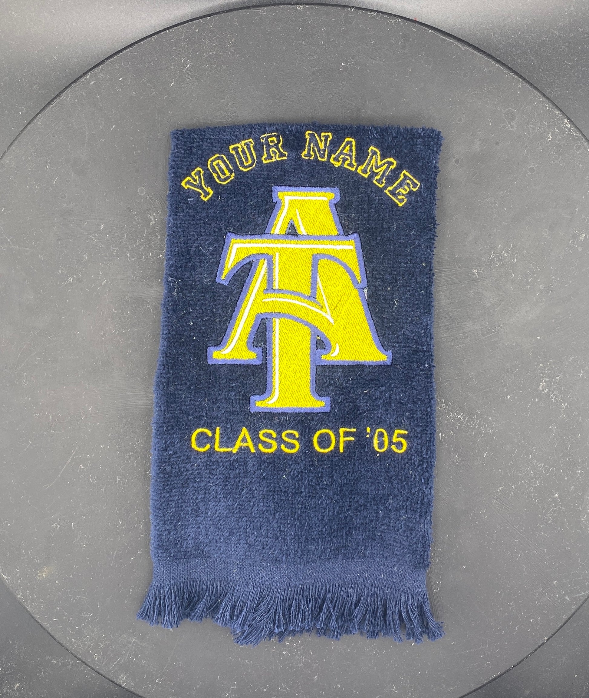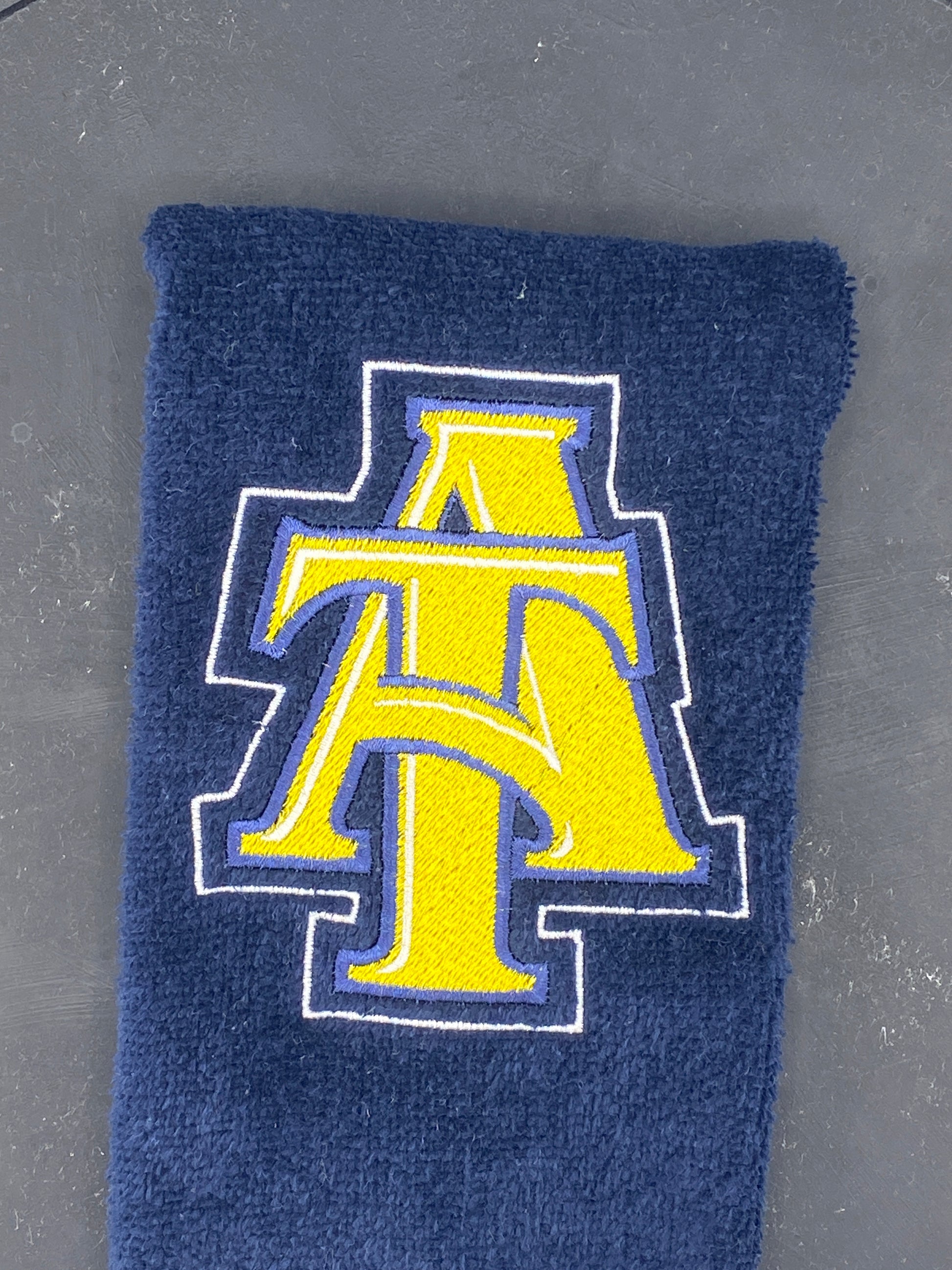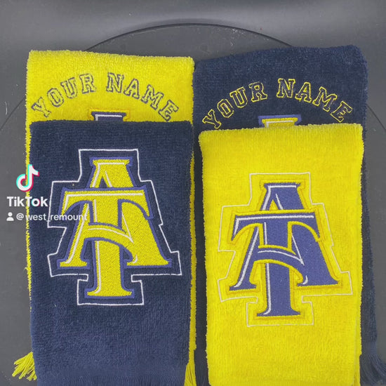 Our North Carolina A&T Leisure Luxe Towel features the iconic intertwined A&T logo, stitched in bold contrasting thread on plush velour. Available in deep navy or vibrant gold, this towel is the perfect blend of heritage and heat. Whether you’re strolling at GHOE, tailgating, or just showing up in style — this towel is your go-to statement piece.